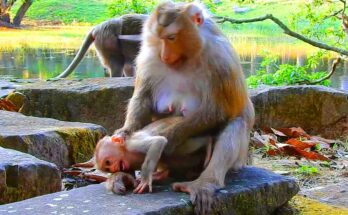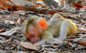 Poor Baby Monkey Crying Because It Misses Mom’s Milk In the quiet corner of a dense green forest, a tiny baby monkey sat curled against a tree root, its soft …