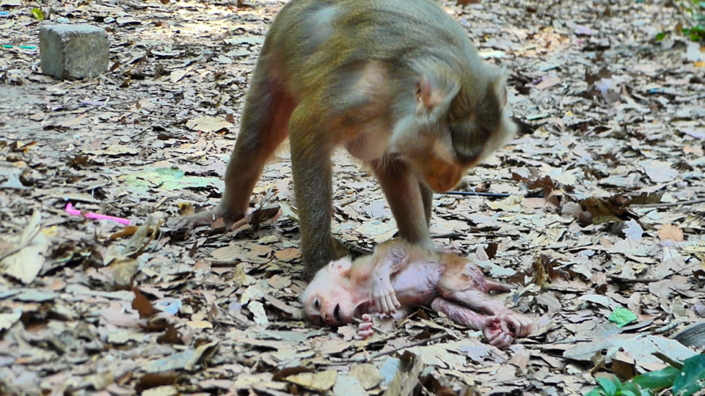 In a peaceful forest setting, an older mother monkey named Daisy experiences a special and hopeful moment as she welcomes a newborn baby boy into the world. The tiny infant, now named Dimitri, rests closely against her, beginning his first day of life in warmth and safety. Despite her age, Daisy shows calm strength and gentle care, keeping her baby secure and close.