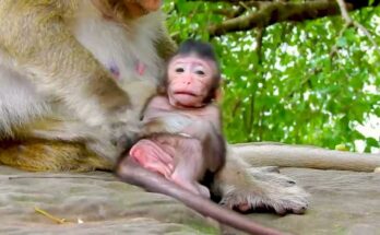 In the quiet corners of the forest, where sunlight filters gently through the leaves, a heartbreaking scene unfolds. A tiny baby monkey sits alone on the ground, its small body trembling and its wide eyes filled with confusion and fear. Only moments ago, this newborn should have been wrapped tightly in its mother’s arms, feeling warmth, safety, and the steady rhythm of her heartbeat. Instead, the baby now faces the world alone, abandoned by the very one it depends on for survival.